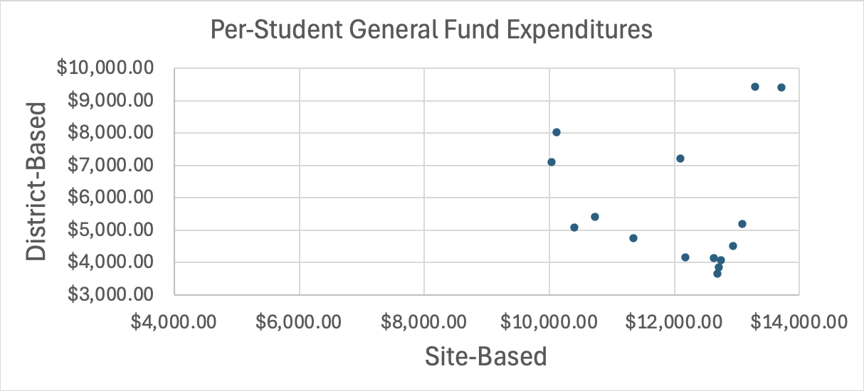 To help put that number into context, I created the following chart, which shows site-based and district-based expenditures per student for each of the 15 districts mentioned previously. Minneapolis and Saint Paul are in the upper right corner.